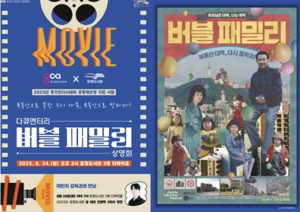 이번 상영은 구리시 토평도서관이 경기콘텐츠진흥원이 주관하는 ‘2025년 경기인디시네마 공동체 상영 지원’ 사업에 선정됨에 따라 진행되는 것이다. ‘버블 패밀리’는 2017년 제14회 EBS 국제다큐영화제(EIDF)에서 한국 작품 최초로 대상을 수상한 화제작으로 한 가족을 통해 1980년대 부동산 열풍과 그 후폭풍을 현실적 시선과 재치 있는 연출로 그려낸 작품이다. 상영회는 사전 신청 없이 당일 현장 선착순 140명까지 무료로 관람할 수 있다.