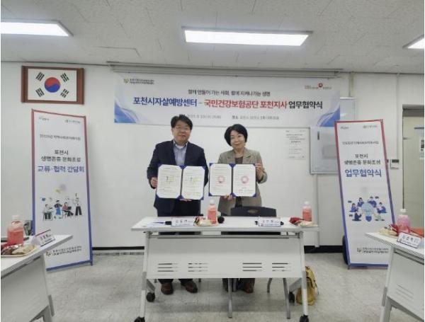 [한국뉴스타임=편집국] 포천시자살예방센터는 지난 20일 국민건강보험공단 포천지사와 포천시보건소 대회의실에서 지역사회 자살률 감소와 생명존중 문화 확산을 위한 업무협약을 체결했다.