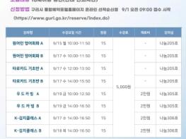 다가오는 가을을 맞아 시민들에게 자기 계발과 창의적 예술 체험 기회를 제공하기 위해 운영되는 이번 강좌는 9월 15일부터 19일까지 1주간 운영된다. 운영 강좌는 ‘원어민 영어회화’, ‘타로카드 기초’, ‘우드카빙’, ‘K-김치클래스’ 등 4과목이며, 각 2회로 구성하여 운영한다.