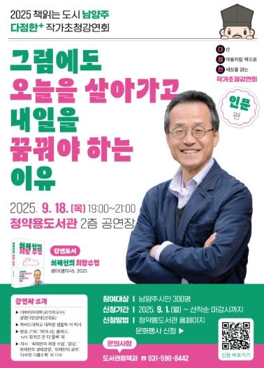 강연은 오후 7시에 시작돼 직장인들도 참여할 수 있으며, 남양주시민 누구나 신청 가능하다. 접수는 9월 1일 오전 10시부터 정약용도서관 누리집 문화행사 신청란을 통해 진행된다.