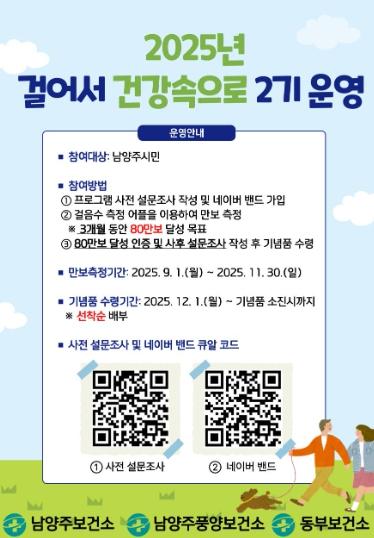 ‘걸어서 건강속으로 2기’는 1기에 이어 남양주·남양주풍양·동부보건소에서 합동으로 운영하고, 9월 1일부터 11월 30일까지 3개월간 개인별 누적 걸음 수 80만 보를 목표로 진행한다.