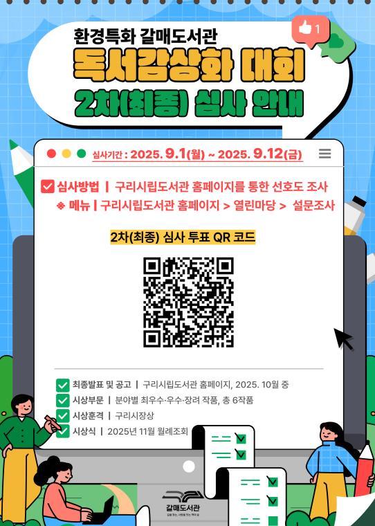 최종 심사는 시민 투표로 진행되며, 구리시립도서관 회원이라면 누구나 홈페이지 열린마당 ' 설문조사 메뉴를 통해 온라인으로 참여할 수 있다.
