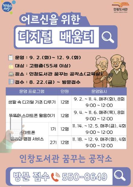 [한국뉴스타임=편집국] 구리시 인창도서관 메이커스페이스 ‘꿈꾸는 공작소’는 9월 2일부터 12월 9일까지 고령층 시민의 디지털 이해력 향상과 정보적 참여 기회 확대를 위한 '2025년 디지털 배움터'를 운영한다.
