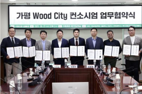 가평군은 27일 국회에서 김용태 의원, 국립산림과학원, 서울대학교 산림과학부 등과 함께 ‘가평 우드시티(Wood City) 컨소시엄’ 업무협약을 체결했다. 이번 협약에는 산림녹화 및 목재 전문기업 수프로와 유니드플러스, 국제 펀딩기관 펀딩박스(FundingBox), 케이펀딩파트너스가 참여했다.