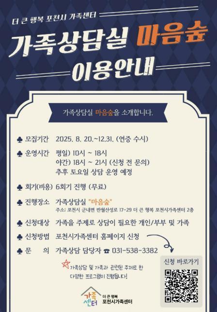 최선희 포천시가족센터장은 “가족상담실 ‘마음숲’은 가족 문제의 조기 발견과 예방적 개입, 가정의 건강성과 기능 회복에 크게 기여할 것으로 기대된다”며 “앞으로도 건강한 가족문화 확산을 위한 다양한 상담 및 교육 프로그램을 지속적으로 발굴·운영해 나가겠다”고 말했다.