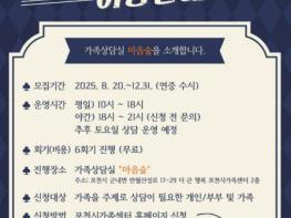 상담은 이혼 전후의 갈등, 부부 갈등, 부모·자녀 관계, 임신·출산 갈등 등 다양한 주제를 다루며, 6회까지 무료 상담을 진행한다. 또한 같은 고민을 가진 개인과 가족이 참여해 해결 방안을 함께 찾는 집단 프로그램 ‘행복 충전 모임’도 운영할 예정이다.