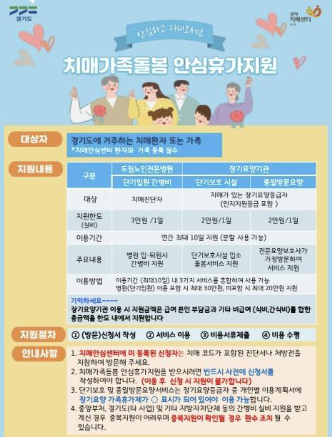 지원 범위는 종일 방문요양과 단기보호시설 이용 시 연 최대 20만 원, 경기도립병원 단기 입원 시 연 최대 30만 원까지 간병비를 지원한다. 또한 방문요양·단기보호서비스·입원 등을 연 10일 이내에서 자유롭게 혼합해 이용할 수 있다.