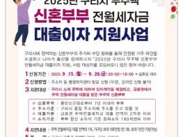 [한국뉴스타임=편집국] 구리시는 관내 무주택 신혼부부를 대상으로 '2025년 무주택 신혼부부 전월세 자금 대출이자 지원사업'을 오는 9월 15일부터 시행한다고 밝혔다.