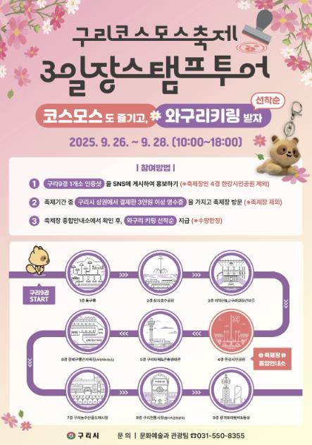 [한국뉴스타임=편집국] 구리시는 오는 9월 26일부터 28일까지 구리한강공원에서 열리는 '코스모스 축제' 기간 동안 ‘3일장 스탬프 투어’ 행사를 진행한다.
