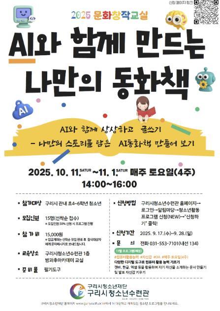 [한국뉴스타임=편집국] 구리시청소년재단 청소년수련관은 ‘AI와 함께 만드는 나만의 동화책’ 프로그램 참가 신청을 9월 17일부터 29일까지 받는다고 밝혔다. 신청은 청소년수련관 홈페이지 내 ‘청소년 활동 프로그램 신청’ 메뉴에서 가능하며, 참가 회비는 15,000원이다. 모집은 선착순으로 진행된다.