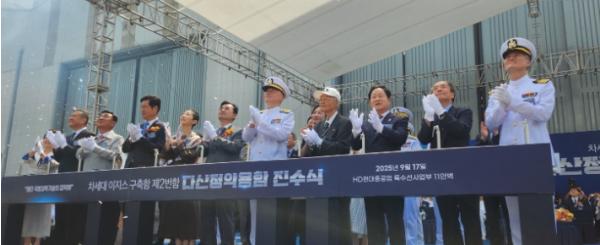 이날 진수식은 안규백 국방부 장관 주관으로 강동길 해군참모총장과 이상균 HD현대중공업 대표이사 등이 참석했으며 △이상균 대표이사의 기념사 △안규백 장관의 유공자 포상과 축사 △진수와 안전 항해 기원의식 순으로 진행됐다.