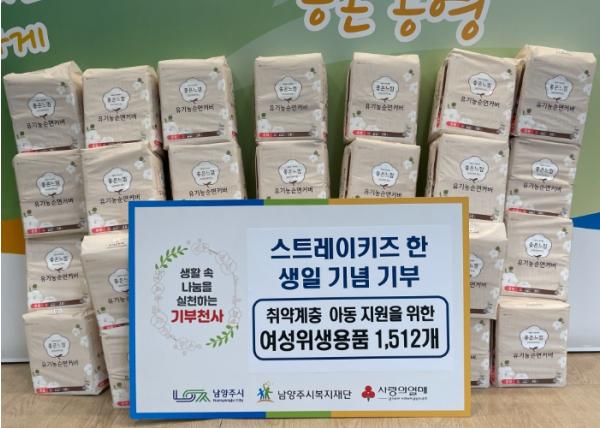 [한국뉴스타임=편집국] 남양주시는 16일 남양주시복지재단이 스트레이키즈 멤버 ‘한’의 팬으로부터 여성용품 1,512개를 기부받았다고 밝혔다. 이번 기부는 ‘한’의 생일(9월 14일)을 기념해 추진됐다.
