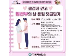 [한국뉴스타임=편집국] 구리시는 제20회‘임산부의 날’(10월 10일)을 기념해 임신과 출산의 가치를 되새기고 시민 건강 증진을 도모하기 위한 ‘즐겁게 걷고, 임산부의 날 응원 댓글 달기’ 챌린지를 오는 10월 10일부터 24일까지 15일간 운영한다고 밝혔다.
