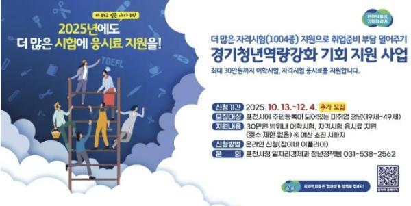추가 모집 기한은 12월 4일까지이며, 포천시에 주민등록이 되어 있는 19세~49세 미취업 청년이면 누구나 신청할 수 있다. 연간 최대 30만 원 한도 내에서 어학시험 또는 각종 자격시험 응시료를 실비로 지원받을 수 있으며, 지원 횟수에는 제한이 없다. 다만, 시험 응시일 기준 미취업 상태여야 하며, 1년 미만 단기근로자도 미취업자로 간주되어 지원받을 수 있다.