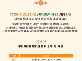 [한국뉴스타임=편집국] 구리시의회는 오는 10월 29일에 구리시청 1층 대강당에서 ‘2025년 지방자치 및 균형발전의 날 기념식’을 개최한다.