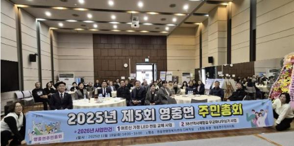 이번 주민총회는 2026년도 영중면 주민자치사업을 선정하기 위해 마련한 자리로, 사전 공연을 시작으로 2025년 주민자치회 활동 경과보고, 2026년 사업 의제 발표, 질의응답, 현장 투표 순으로 진행했다.