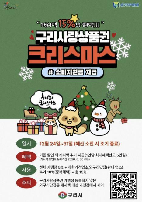 [한국뉴스타임=편집국] 구리시는 12월 24일부터 ‘구리사랑상품권 크리스마스 소비 지원금’을 지급한다고 밝혔다. 이번 소비 지원금은 연말연시 기간 지역 외로 유출되는 소비를 지역 내로 유도하고, 관내 상권 활성화와 소상공인 보호를 위해 마련됐으며, 예산 소진 시 조기 종료될 수 있다.