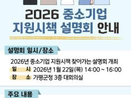 가평군은 관내 중소기업을 대상으로 ‘2026년 중소기업 지원시책 설명회’를 오는 22일 오후 2시 가평군청 3층 대회의실에서 개최한다고 밝혔다. 이번 설명회는 2026년도 중소기업 지원정책을 종합적으로 소개하는 한편 기업 현장의 애로사항을 직접 청취해 정책 수요에 반영하기 위해 마련됐다. 설명회에는 중소벤처기업진흥공단, 기술보증기금, 소상공인진흥공단, 경기중소벤처기업청 등 10개 기관이 참여한다.