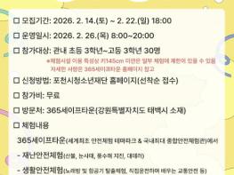 모집 대상은 관내 초등학교 4학년부터 고등학교 3학년까지 청소년 30명이며, 참가비는 무료다. 신청은 2월 22일 오후 6시까지 포천시청소년교육문화센터 누리집을 통해 가능하다.