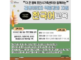 [한국뉴스타임=편집국] 포천시 더 큰 행복 포천시가족센터는 2026년 결혼이민자 역량강화 지원 사업의 일환으로 한국어교육 과정을 수준별, 단계별 체계로 확대 개편하고 본격적인 운영에 들어갔다.