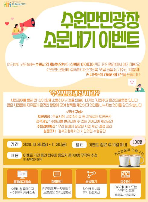 [KNT한국뉴스타임] 수원시가 ‘수원만민광장’을 SNS로 홍보한 시민 중 100명을 추첨해 모바일 상품권을 선물하는 ‘수원만민광장 소문내기 이벤트’를 연다.