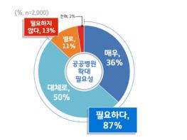 경기도는 9월 25일부터 10월 7일까지 도민 2,000명을 대상으로 공공보건의료 관련 여론조사를 실시한 결과, 응답자의 87%가 경기도의료원과 같은 공공병원 확대에 대해 ‘필요하다’고 답했다고 밝혔다. 응답자의 76%는 경기도의료원의 개수가 ‘충분하지 않다’고 답해 도민 대다수가 공공병원 확대 필요성에 높은 공감을 보였다.