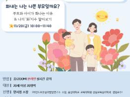 ‘2020 부모교육 특강’은 민서정 소장(마인드포유심리발달연구소 소장, 숭실대학교 교육대학원 상담교육심리학과 겸임교수)의 진행으로, 11월 20일과 27일 총 2회에 걸쳐 열린다.