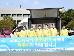 지난 5월 영국에서 코로나19 확진자가 급격히 증가할 때 파주시는 ‘글로스터시의 코로나19 극복에 파주시가 함께 합니다’라는 문구와 함께 글로스터시에 방역복 세트 1,000벌을 보냈고 글로스터시 노인요양원 의료진에게 보급됐다. 이에 글로스터시는 진실한 우정에 감동 받았다며 감사 서한문을 파주시에 보내왔으며 글로스터셔주 주지사와 글로스터셔주 명예협회장도 함께 감사 편지를 보내왔다.