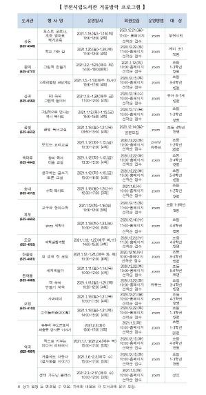 겨울방학 프로그램 운영 내용과 회원 모집 등 기타 자세한 사항은 부천시립도서관 홈페이지를 참고하면 된다.