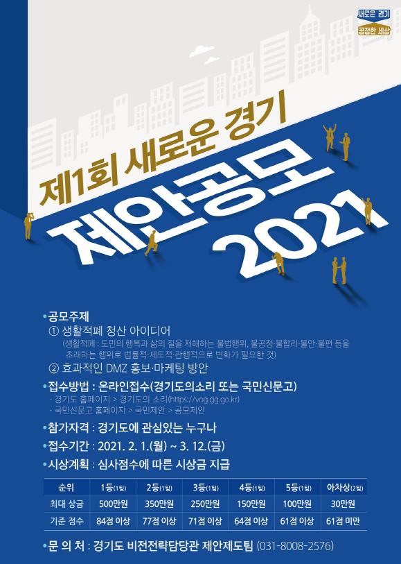 도는 1일부터 다음달 12일까지 ‘경기도의 소리’ 홈페이지 및 국민신문고 ‘공모제안’ 코너에서 ‘새로운 경기 제안공모 2021’을 진행한다.