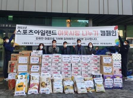 [KNT한국뉴스타임] ㈜스포츠 아일랜드(대표이사 백성욱)에서는 지난 4일 우만1동 행정복지센터(동장 이기조)에 쌀 21포, 라면 136박스 및 생필품을 기탁하는 설 명절 이웃사랑 나눔 행사를 실시하였다.