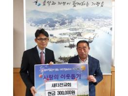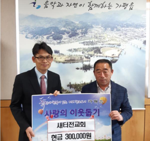 [KNT한국뉴스타임] 가평읍 소재 새터전교회 목사님이 오늘 18일 가평읍사무소를 방문하여 '코로나19' 극복을 위해 써달라며 지난 주일 모금한 헌금 30만 원을 기탁했다.