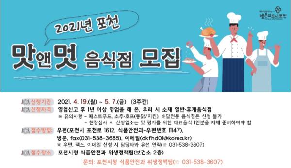 [KNT한국뉴스타임] 포천시는 5월 7일까지 관내 일반·휴게음식점을 대상으로 2021년 맛앤멋 음식점 신규 신청을 접수받는다.