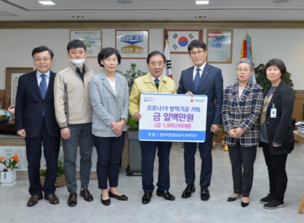 [KNT한국뉴스타임] 한국국토정보공사 포천지사(지사장 견병식)는 지난 21일 코로나19와 관련하여 방역기금으로 사용해 달라며 성금 100만원을 포천시에 전달했다.