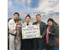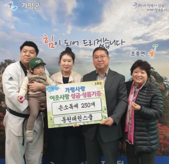 [KNT한국뉴스타임] 가평군 동원태권스쿨(관장 동상운)는 지난 21일 조종면행정복지센터(면장 박재근)를 찾아 취약계층을 위한 휴대용 손소독제 250개를 기탁하였다.