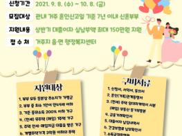 [한국뉴스타임=명기자] 가평군이 2021년 신혼부부 주거자금 대출이자 지원 사업을 실시한다. 전세자금, 매입자금의 대출이자를 최대 150만원 지원하며 오는 9월 8일부터 10월 8일까지 대상자를 모집한다.
