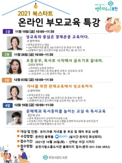 북스타트 부모교육 특강은 소흘도서관 홈페이지로 접수 가능하며, 기타 자세한 내용은 포천시 소흘도서관로 문의하면 된다.