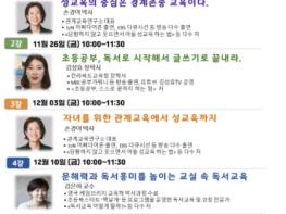 특강은 ▲11월 19일 10시 ‘성교육의 중심은 경계존중 교육이다’(손경이 박사) ▲11월 26일 10시 ‘초등공부, 독서로 시작해서 글쓰기로 끝내라’(김성효 장학사) ▲12월 3일 10시 ‘자녀를 위한 관계교육에서 성교육까지’(손경이 박사) ▲12월 10일 10시 ‘문해력과 독서 흥미를 높이는 교실 속 독서교육’(김은하 작가) 등 총 4회로 온라인 플랫폼 zoom(줌)을 통해 진행된다.