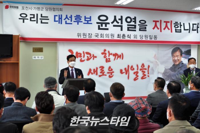 [한국뉴스타임=이명수기자] 30일 오후 4시 최춘식 국회의원은 국민의힘 포천가평당원협의회 핵심당원들이 참석한 가운데 ‘우리는 대선후보 윤석열을 지지합니다.‘ 지지모임을 하였다.