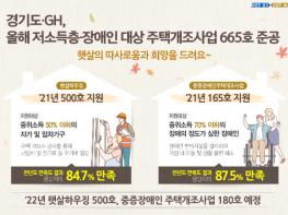 [한국뉴스타임=명기자] 경기도와 경기주택도시공사(GH)는 주거취약계층 주거환경 개선 사업으로 저소득 가구 대상 ‘햇살하우징’ 500호, ‘중증장애인 주택개조사업’ 165호 등을 준공해 올해 목표치 665호를 달성했다고 7일 밝혔다.