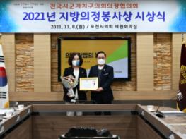 [한국뉴스타임=명기자] 포천시의회 박혜옥 의원이 전국시군자치구의회의장협의회에서 수여하는 지방의정봉사상을 수상하는 영예를 안았다.