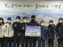 [한국뉴스타임=명기자] 가평읍 체육회는 8일, 가평읍행정복지센터에서 가평중·고 육상부에 2백만원의 후원금을 전달하고 우수한 성적으로 지역의 위상을 빛낸 선수들에 대한 격려의 시간을 가졌다.