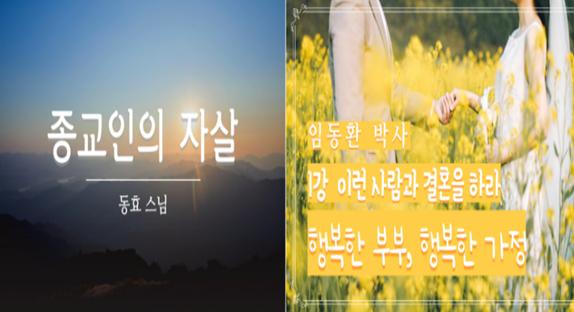 동효 스님은 종교가 있어도 자살충동을 느끼는 이들의 원인과 해결방법 ‘종교인의 자살’을, 임동환 박사는 결혼 전 고려할 점과 건강한 부부의 의사소통 방법인 ‘행복한 부부, 행복한 가정’을 주제로 이야기한다.