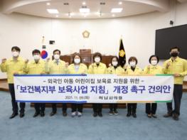 또 부모의 신분에 상관없이 대한민국에 합법적으로 체류하고 있는 외국인 아동이 보육료 지원에서 소외되지 않도록 하기 위한 ‘외국인 아동 어린이집 보육료 지원을 위한 「보건복지부 보육사업 지침」개정 촉구 건의안’도 만장일치로 채택했다.