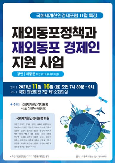 [한국뉴스타임=명기자] 단계적 일상회복으로 국회 활동 역시 활발해지는 가운데 여·야 국회의원이 함께 모여 재외동포 경제인을 지원하기 위한 특강이 진행된다.