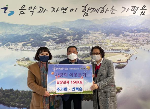 [한국뉴스타임=명기자] 조가하 ․ 신복순님은 11월 12일 가평읍행정복지센터 맞춤형복지팀에 관내 어려운 이웃에게 전달해 달라며 사랑의 이웃돕기 성품 김장김치 150kg을 기탁했다.