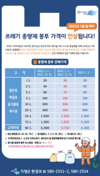 [한국뉴스타임=명기자] 가평군은 올해 11월 폐기물관리 조례를 개정하고 내년 2022년 1월 1일부터 2023년까지 쓰레기 종량제 봉투 판매가격을 매년 단계적으로 인상할 계획이라고 밝혔다.