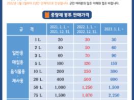 2022년도에 판매되는 종량제 봉투의 색상을 변경하고 가장 많이 판매되는 20ℓ봉투를 기준으로 현 400원에서 600원으로 150% 인상되나, 주민 부담을 고려해 판매가격을 2022년 500원 2023년 600원 2년간 단계적 인상을 추진할 계획이다. 또한 음식물쓰레기 1ℓ봉투제작, 100ℓ 종량제봉투 제작중단 등의 판매정책이 일부 변경되었다.