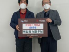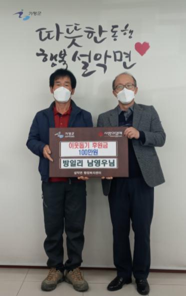 [한국뉴스타임=명기자] 설악면 방일2리 거주하는 남영우씨는 지난 11일 설악면행정복지센터를 조용히 방문하여 어려운 이웃을 위해 써달라며 이웃돕기 성금 100만원을 기탁하고 돌아갔다.