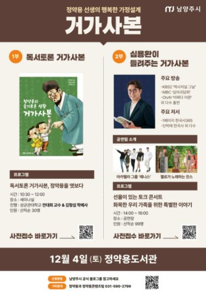 ‘정약용 선생의 행복한 가정설계, 거가사본’은 남양주시 블로그에서 사전 예약을 통해 1, 2부 프로그램에 각각 무료로 참여 신청할 수 있으며, 기타 자세한 사항은 남양주시 정약용과 정약용콘텐츠팀으로 문의하면 된다.